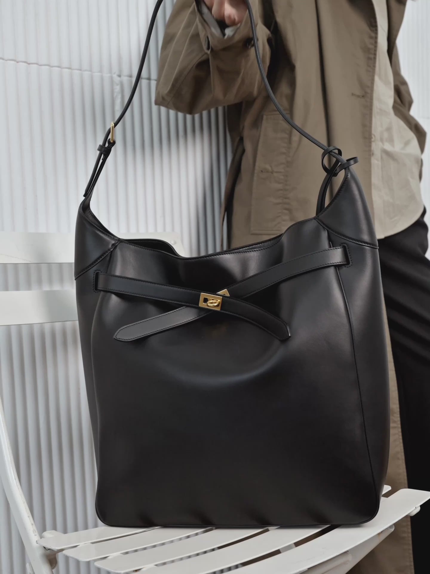 A sleek hobo bag in supple leather, blending practicality with a touch of futurist elegance. The large size is poised and commanding, while the small is light and versatile. Multiple carry options make it suitable for both business and leisure.