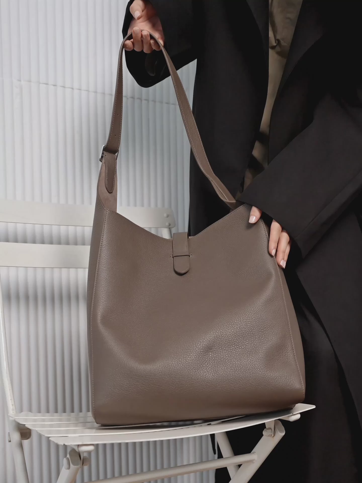 A hobo bag with a substantial yet refined presence. Crafted in supple grained calfskin, its clean silhouette pairs softness with structure. Lightweight with generous capacity and an adjustable strap, it shifts effortlessly between work and leisurean understated essential for the old-money minimalist.