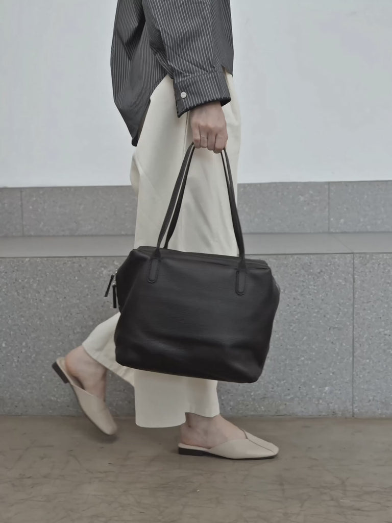 A minimalist shoulder bag crafted in imported full-grain leather with natural tumble finish. Each piece carries unique grain patterns, with supple leather that becomes softer and more lustrous over time. Its rectangular base and tubular handles create a sharp, refined silhouette, free from overt logos—inviting the wearer to define their own style. A pure expression of discreet luxury.